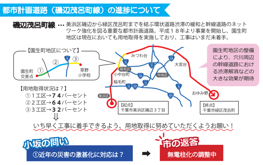 磯辺茂呂町線の完成までは、まだ数年かかる見通しです。だからこそ今、行政と市民が未来のビジョンを共有し、「どんな道路があれば、暮らしがもっと豊かになるか」を一緒に考えていく時期に来ています。これからのまちづくりに、引き続きみなさんの声を届けていきます。
