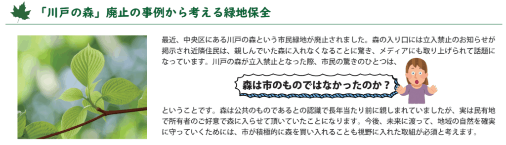 中央区の「川戸の森」が廃止され、立入禁止となったことに多くの市民が驚きました。